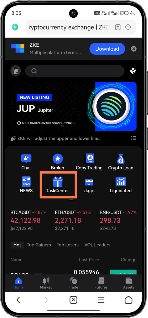 Use your browser to enter the website zke.com and open the ZKE Exchange platform.