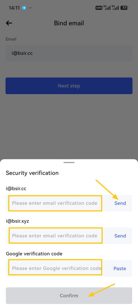 6. Tap the 【Send】 button to dispatch verification codes to both your old and new email addresses (if Google Authenticator is enabled, enter your Google Authenticator code; if a phone number is bound, enter the SMS verification code). After filling in all required codes, tap the 【Confirm】 button.